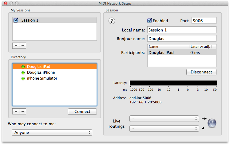 From the MIDI Studio window (accessible from the Window menu if not already visible), double click on Network to open access its settings.